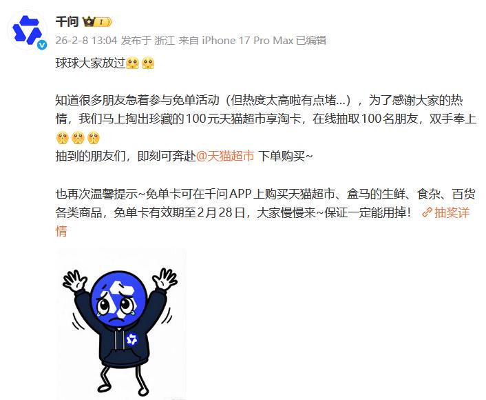 2月6日,阿里通义千问启动30亿红包举止。9小时内,订单量突破1000万单。千问App登顶苹果App Store免费榜第一。支吾媒体上,晒单和“AI购”成为本年春节的新流行。多家媒体评价这是“AI时间第一场气候级事件”。